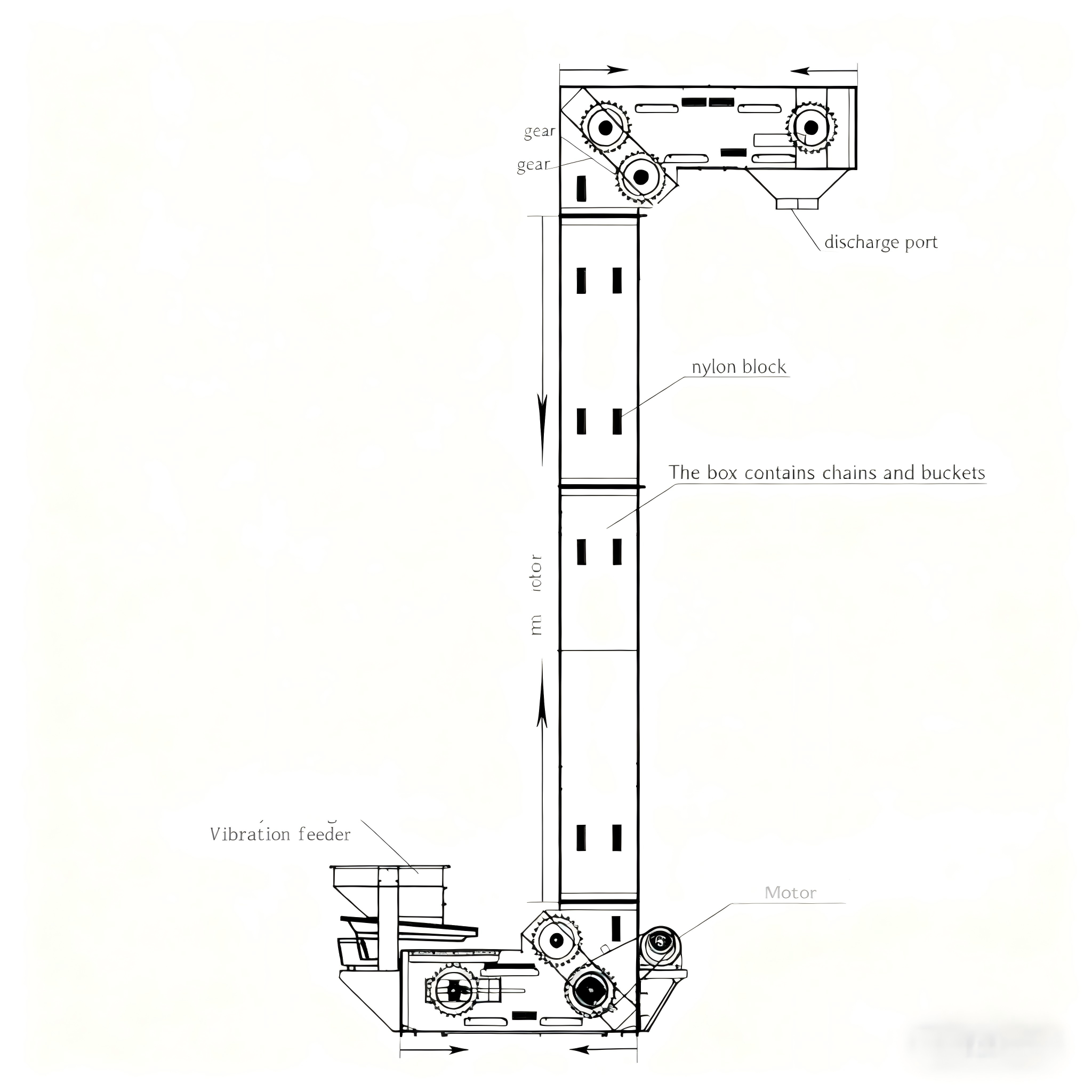 Bucket elevator is a continuous conveying machine that vertically transports bulk materials. It mainly consists of a series of buckets evenly fixed to endless traction components such as chains or belts. These buckets are driven by the traction components to move upward along vertical or inclined tracks, thus realizing the continuous lifting and conveying of materials.